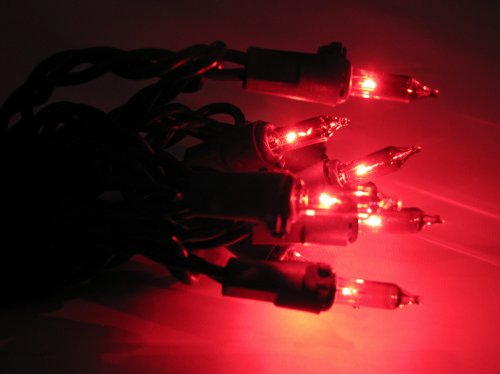 100 SuperBright red lights on a green cord. Total length of 44-feet. The Ultimate quality light set features 6-Inch designer space. LiteLock bulbs eliminate light failure. If one or more bulbs go out the rest of the strand stays lit. Add-a-set: plug at both ends. with this regular light set you can connect up to 3 sets end to end on one outlet. Each light set is pre-tested and guaranteed to light. UL approved for indoor or outdoor use. Four spare bulbs included.100 Red lights on a green, 44-Feet long cord with 6-Inch light spacing