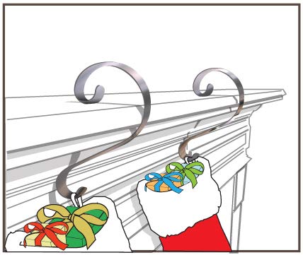 A very ornate yet also functional stocking holder, Stocking Scrolls have the capability of holding a full stocking on the fireplace mantel. They have a gripper pad to prevent scratches and help hold it in place. This products ability to swivel will allow it to fit almost any sized mantel. Lightweight design is safer for homes with children, versus heavy, counter-balance stocking holders. Won't interfere with other holiday decor on the top of mantel.A safe alternative to heavy stocking holders that can injure curious children or pets.