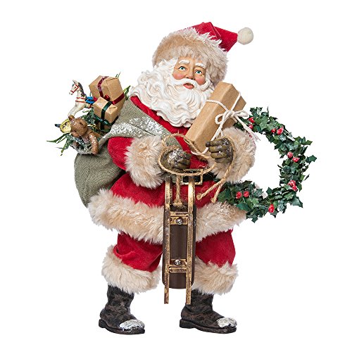 This 11.75-Inch vintage Santa with presents, sled, and wreath is a beautiful and festive addition to any holiday decor. This vintage-inpsired piece features Santa Claus wearing his signature red and white suit and hat, holding a wreath, gift box, and sled in his arms. On his back is a large sack filled with presents for an extra festive touchPart of the Kurt Adler fabric collection